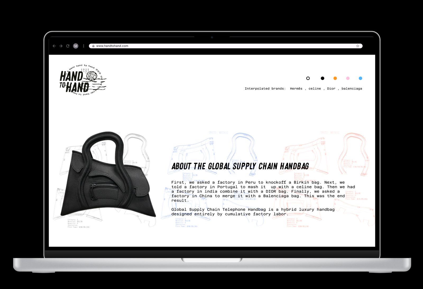 Hand to Hand is a campaign for MSCHF’s Global Supply Chain Handbag, assembled across four countries with elements from Hermès, Dior, Balenciaga, and Céline. Crafted in Peru, Portugal, India, and China, the bag carries both global collaboration and the imprint of its artisans.